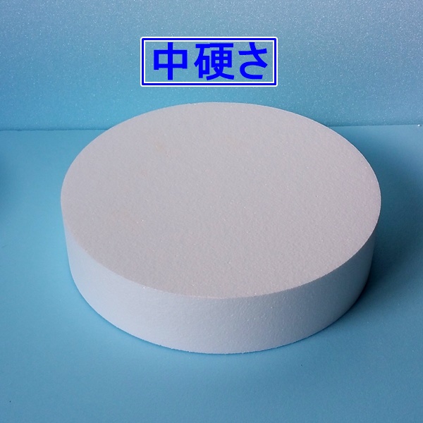 発泡スチロールのサイズは、円柱200mm×厚さ50mm 12個入りの商品です。硬さは、当店にては普通硬さ・中硬さ・高硬さに分類しています。